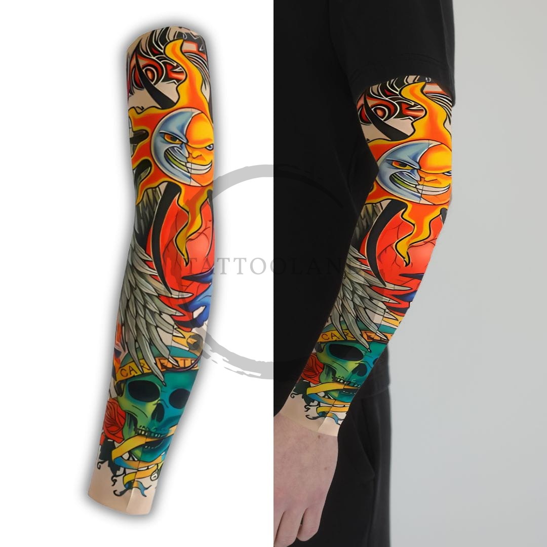 Rękaw materiałowy z nadrukiem w stylu tatuażu to efektowny sposób na zmianę swojego wyglądu bez wykonywania prawdziwego tatuażu. Idealny na imprezy, koncerty, sesje zdjęciowe czy jazdę motocyklem.