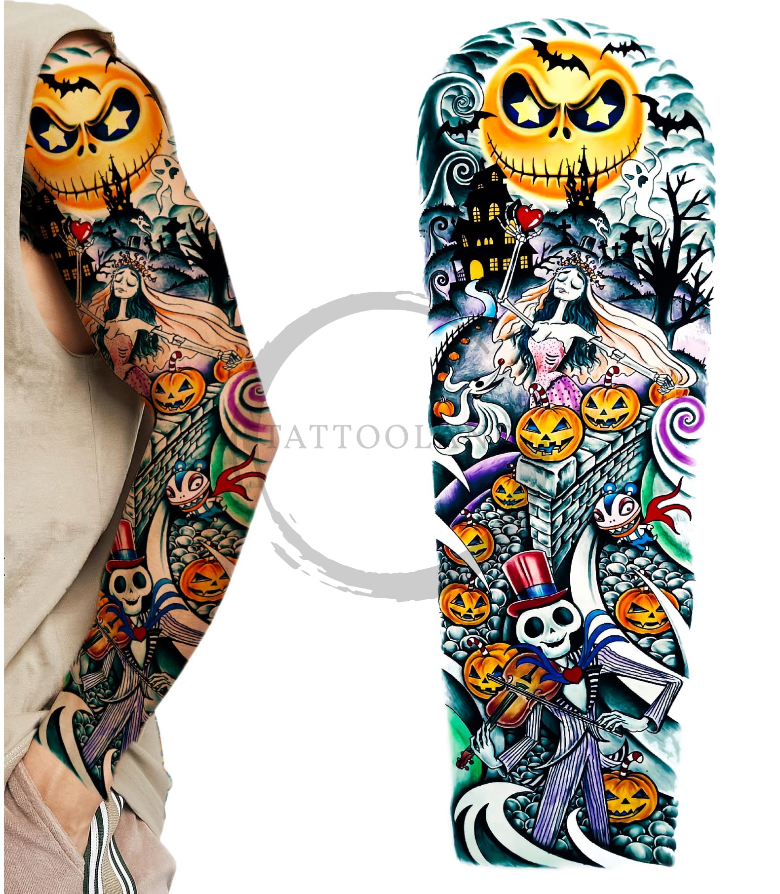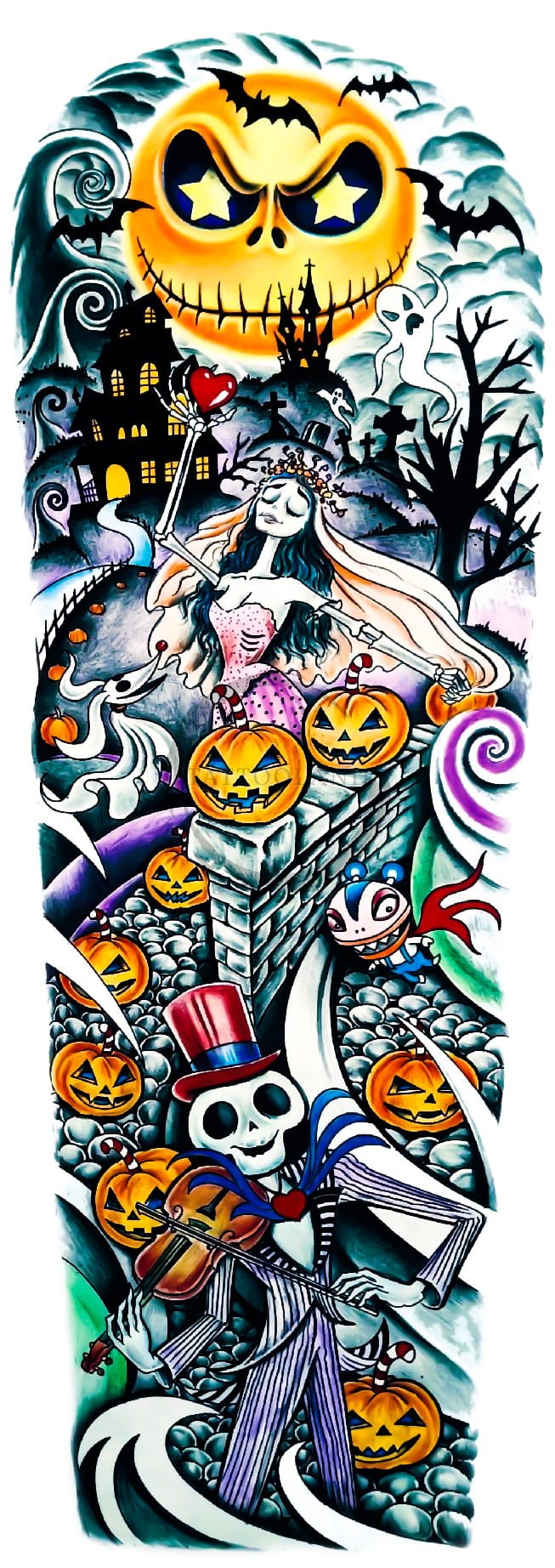 Tatuaż rękaw na halloween dynie kościotrup